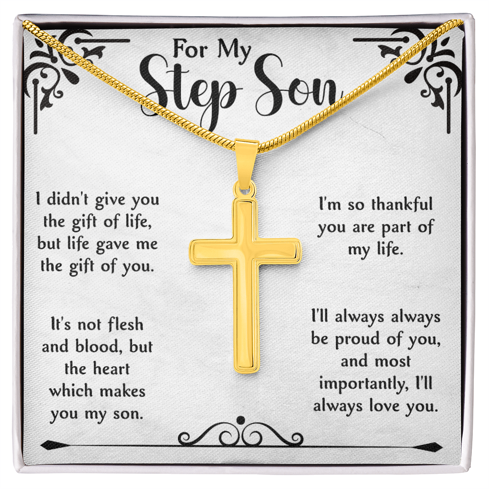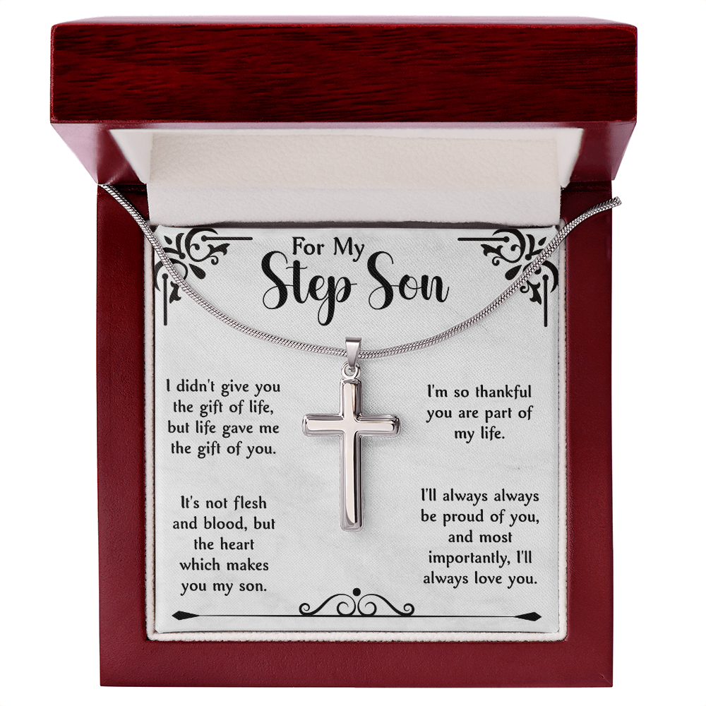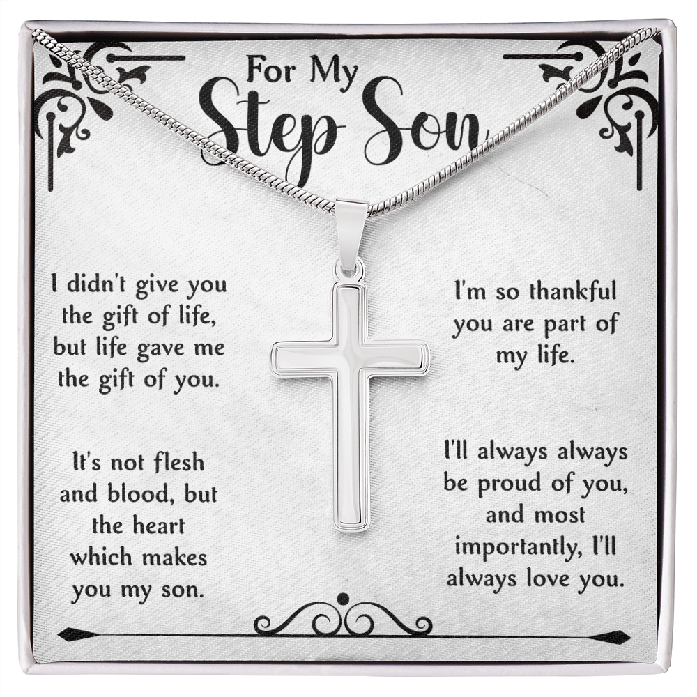 For My Step Son Artisan Cross Necklace – Meaningful Christian Gift for Stepson – Stainless Steel Cross with Snake Chain & Message Card