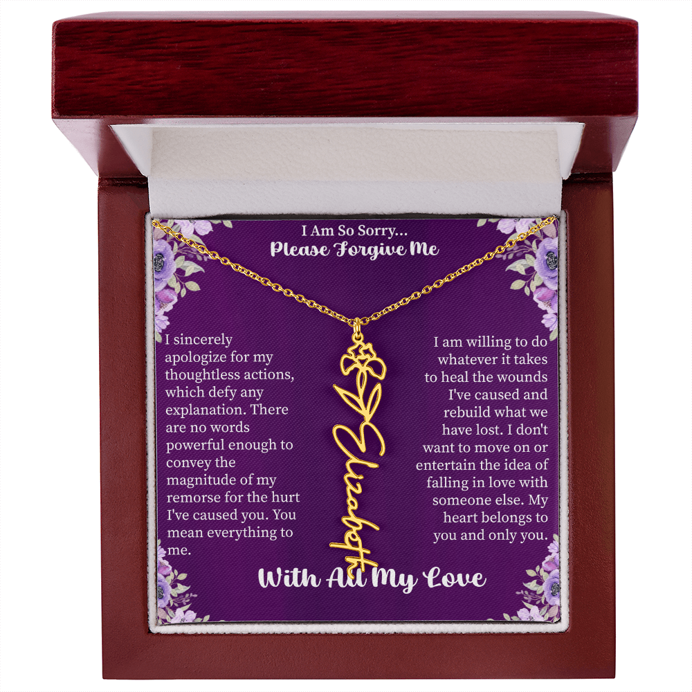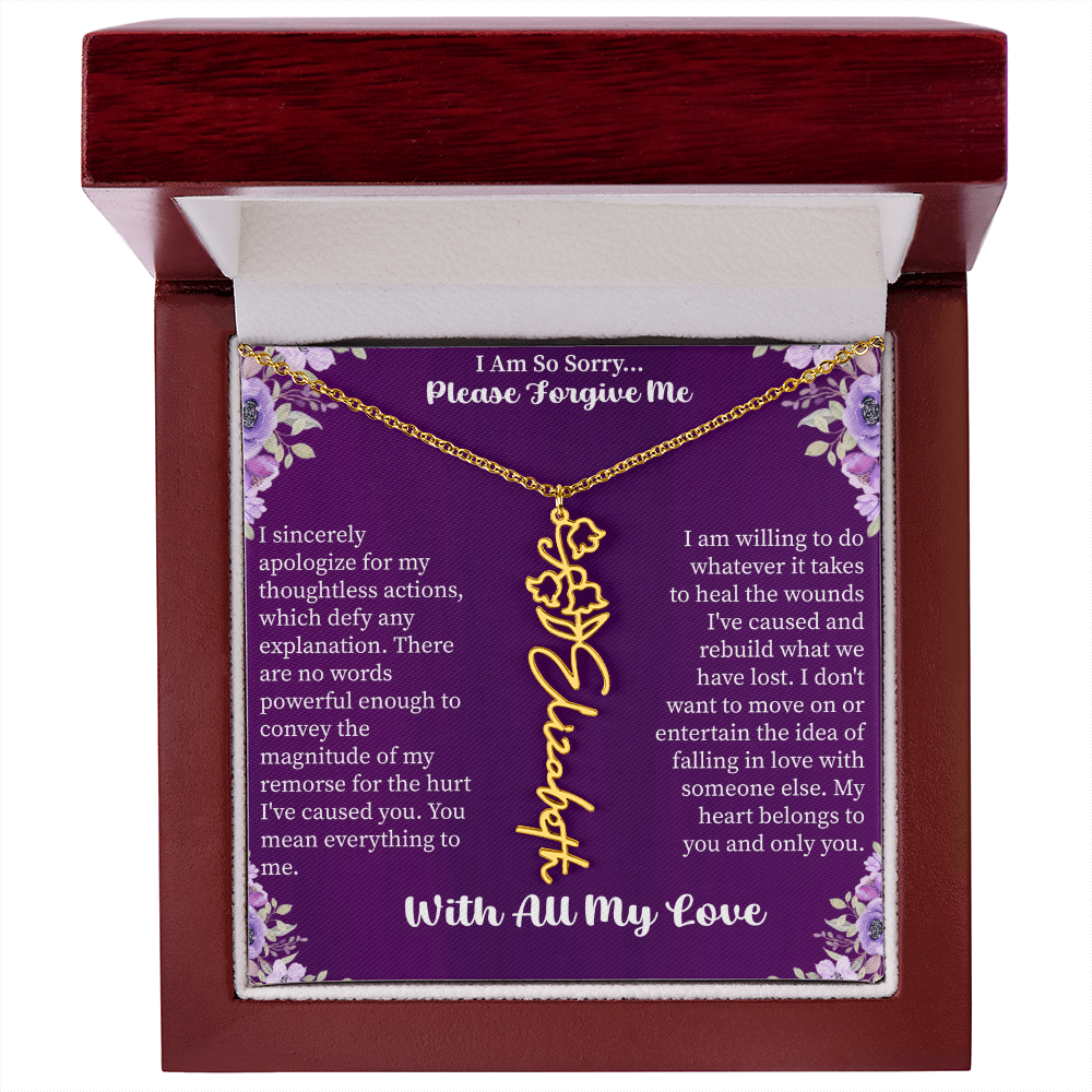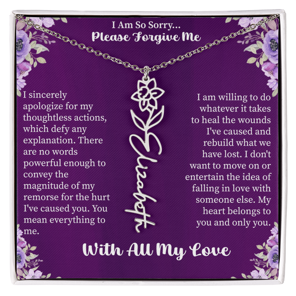 I'm So Sorry Please Forgive Me Flower Name Necklace – Apology Gift – Personalized Floral Name Jewelry with Message Card